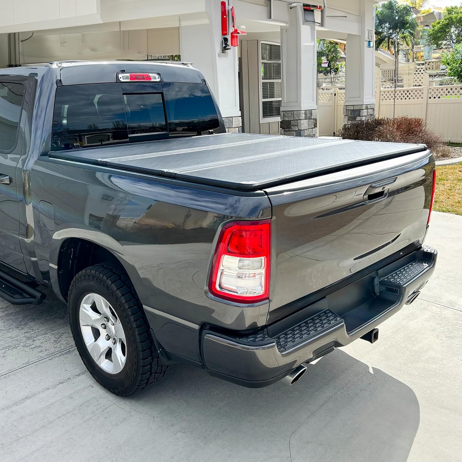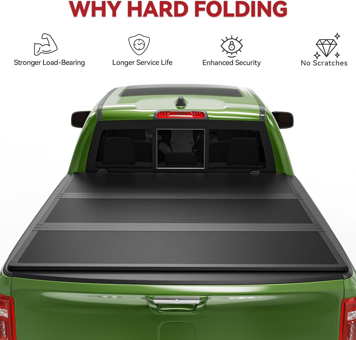 No-drill Installation: Install the hard tri-fold tonneau cover in no time without any drilling or modifications needed; Comes with detailed instructions for added convenience; Note that if your truck has cargo racks remove them before installing this cover