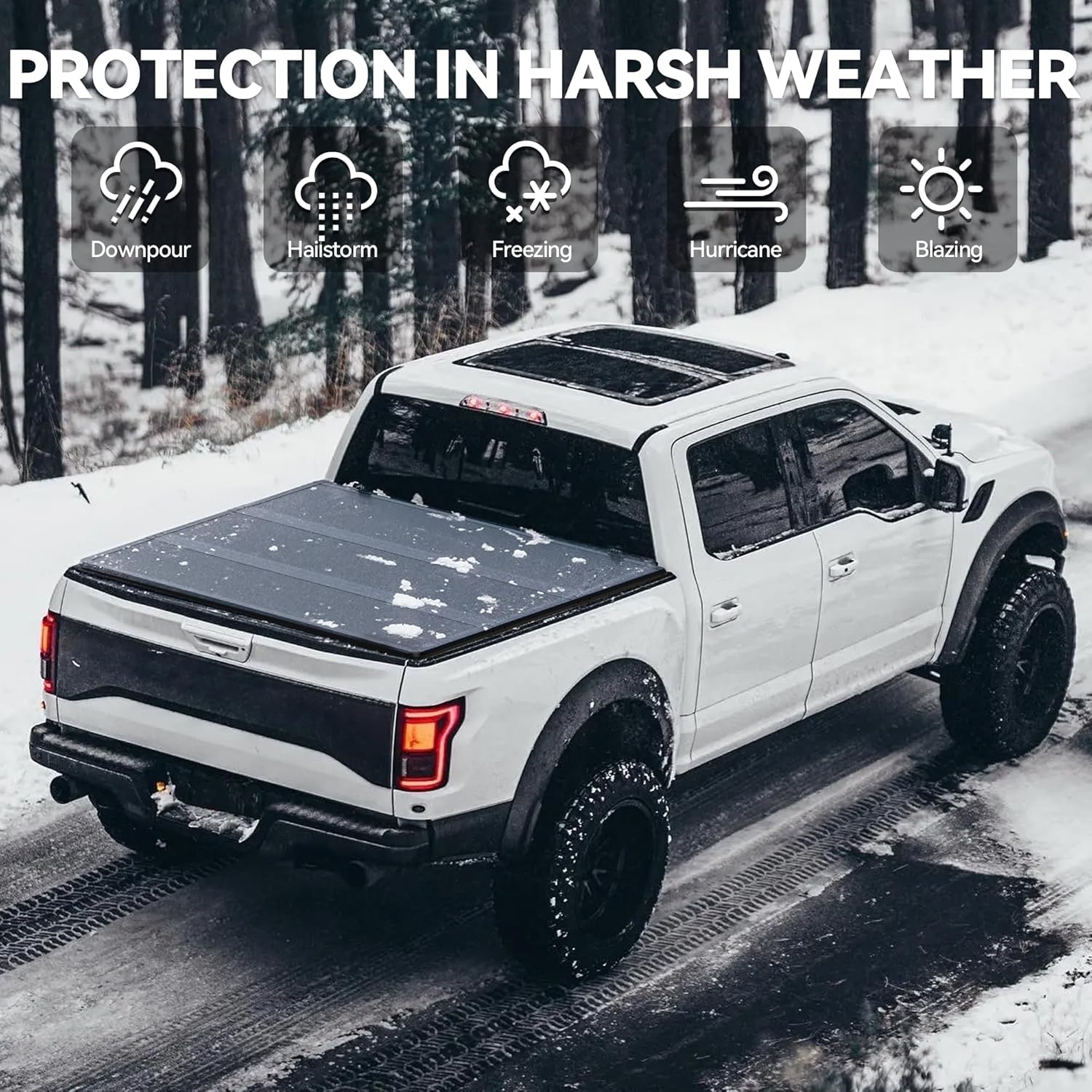 Element-Proof Cargo Cover: Crafted with high-quality Fiberglass Reinforced Polymer (FRP) sheet our truck bed tonneau cover offers great scratch resistance and protection against different weather elements including rain snow dirt and UV rays. Enjoy reliable durability without fading or cracking