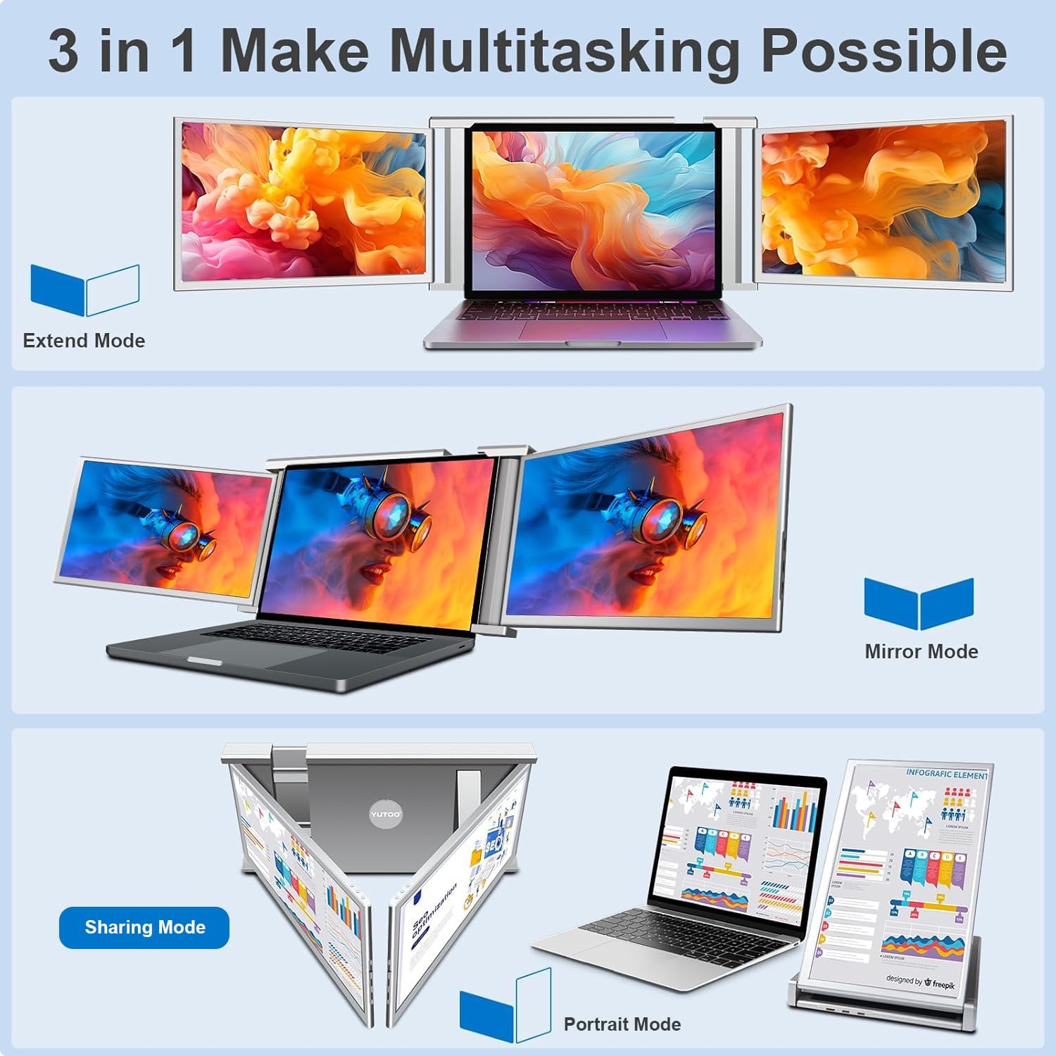 Versatile AdjustabilityOur laptop screen extender offers 315 rotation for dual screens along with three modes: extended AAB mirroring and portrait. Whether you're gaming working or on the go you can easily enhance your productivity by up to 300%. The S1 laptop monitor extender is foldable and compact making it convenient to carry. It also comes with a protective carry bag to safeguard your laptop.