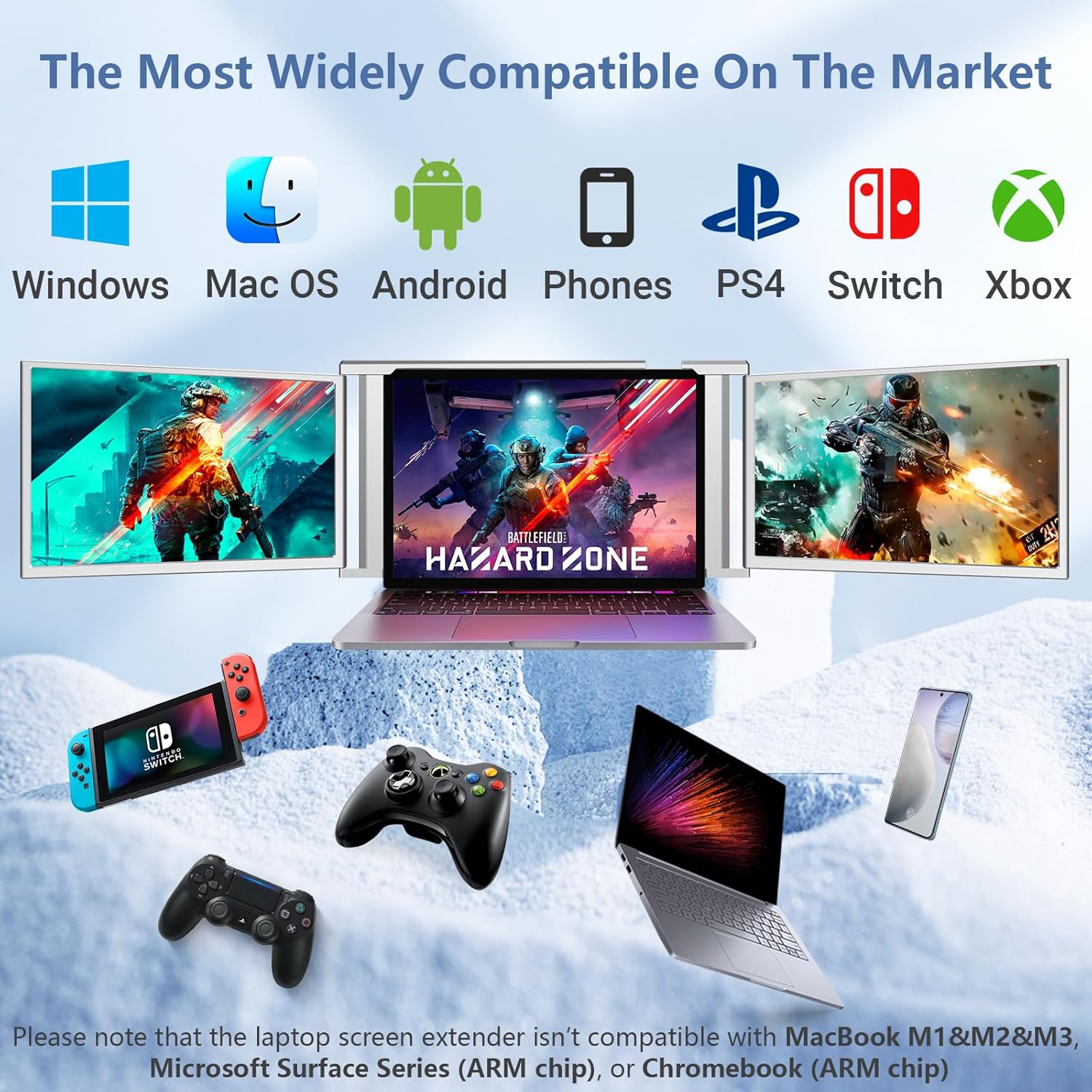 Wide CompatibilityThe Laptop Monitor Extender known as the S1 Portable Monitor is compatible with various devices including laptops mobile phones PS5 and Switch. No drivers are required simply plug and play. The package includes a comprehensive range of data cables ensuring compatibility with different devices. Please note that the laptop screen extender is not compatible with MacBook M1&M2&M3 Microsoft Surface Series (ARM chip) or Chromebook (ARM chip).