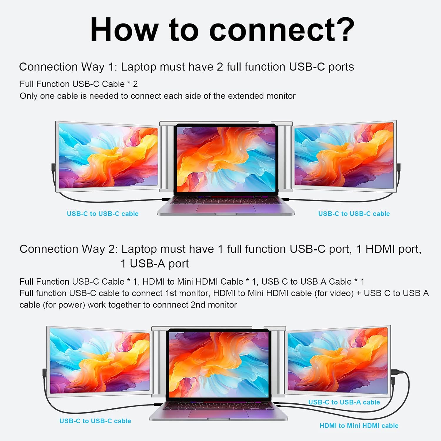 Versatile AdjustabilityOur laptop screen extender offers 315 rotation for dual screens along with three modes: extended AAB mirroring and portrait. Whether you're gaming working or on the go you can easily enhance your productivity by up to 300%. The S1 laptop monitor extender is foldable and compact making it convenient to carry. It also comes with a protective carry bag to safeguard your laptop.