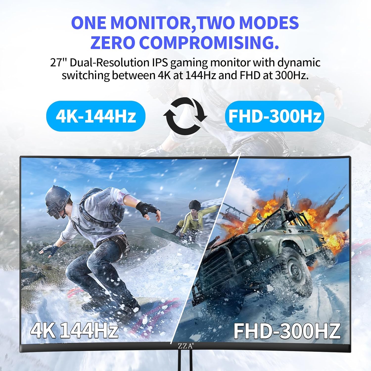 How to switch between 4K 144Hz and 1K 300Hz? 1. Press the menu button to bring up the menu then select QuickLink. 2. Press the function key down to select DualModSupport. 3. When the Off and On options appear select On. 4. Conversion complete.