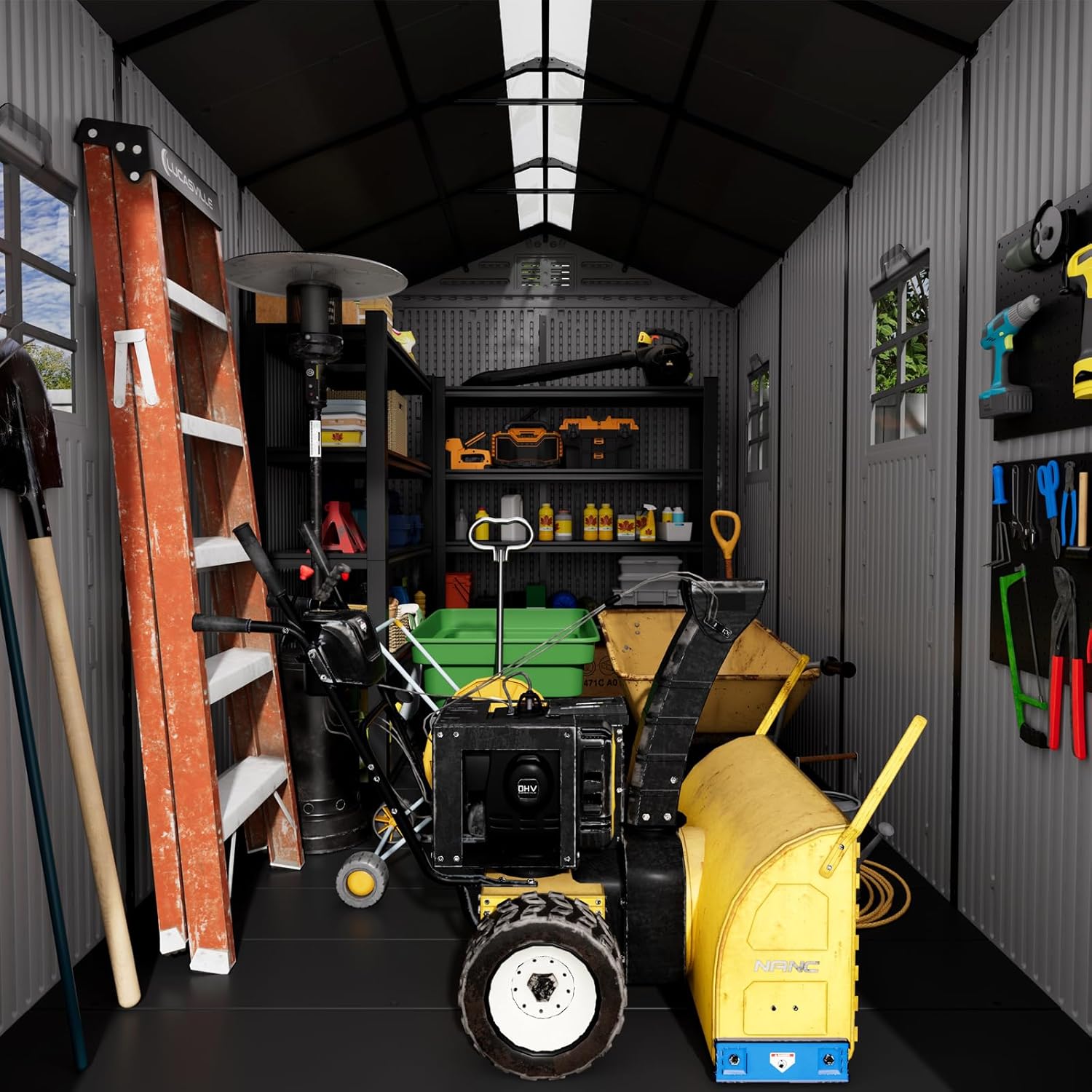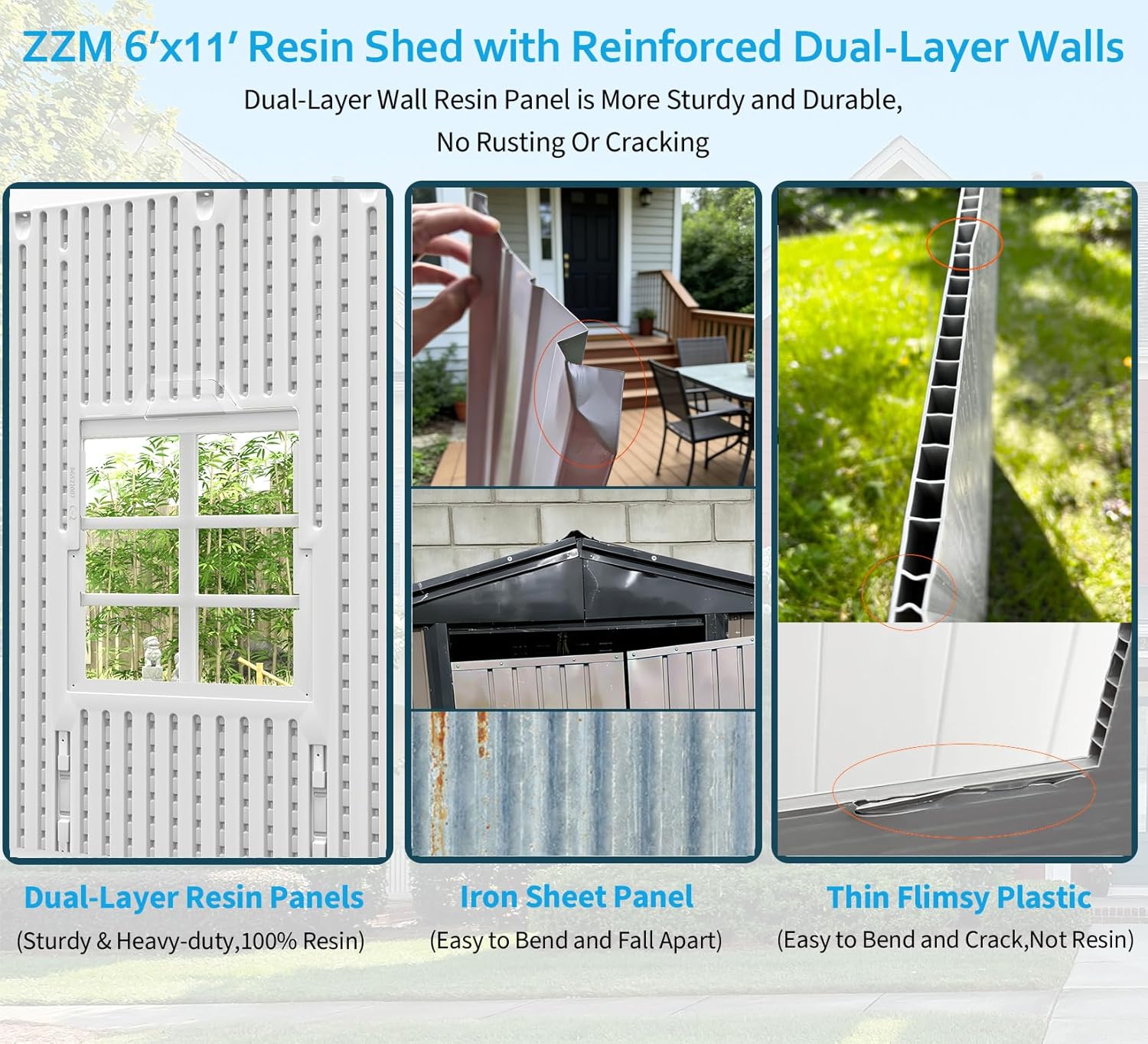 Double-layer Resin & Metal Frame Structure-- All the resin panels of this outdoor storage shed are of double-layer structure which can prevent the panels bending or cracking. The roof is supported by stronger metal frame which is composed of thicker metal rods with a load-bearing capacity of up to 0.3 kN per Sq.m that effectively resisting strong winds heavy rain and snow-retention without falling apart.