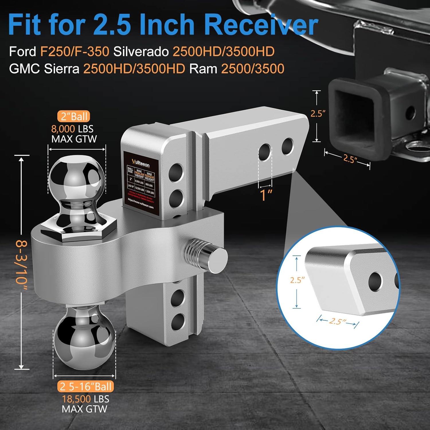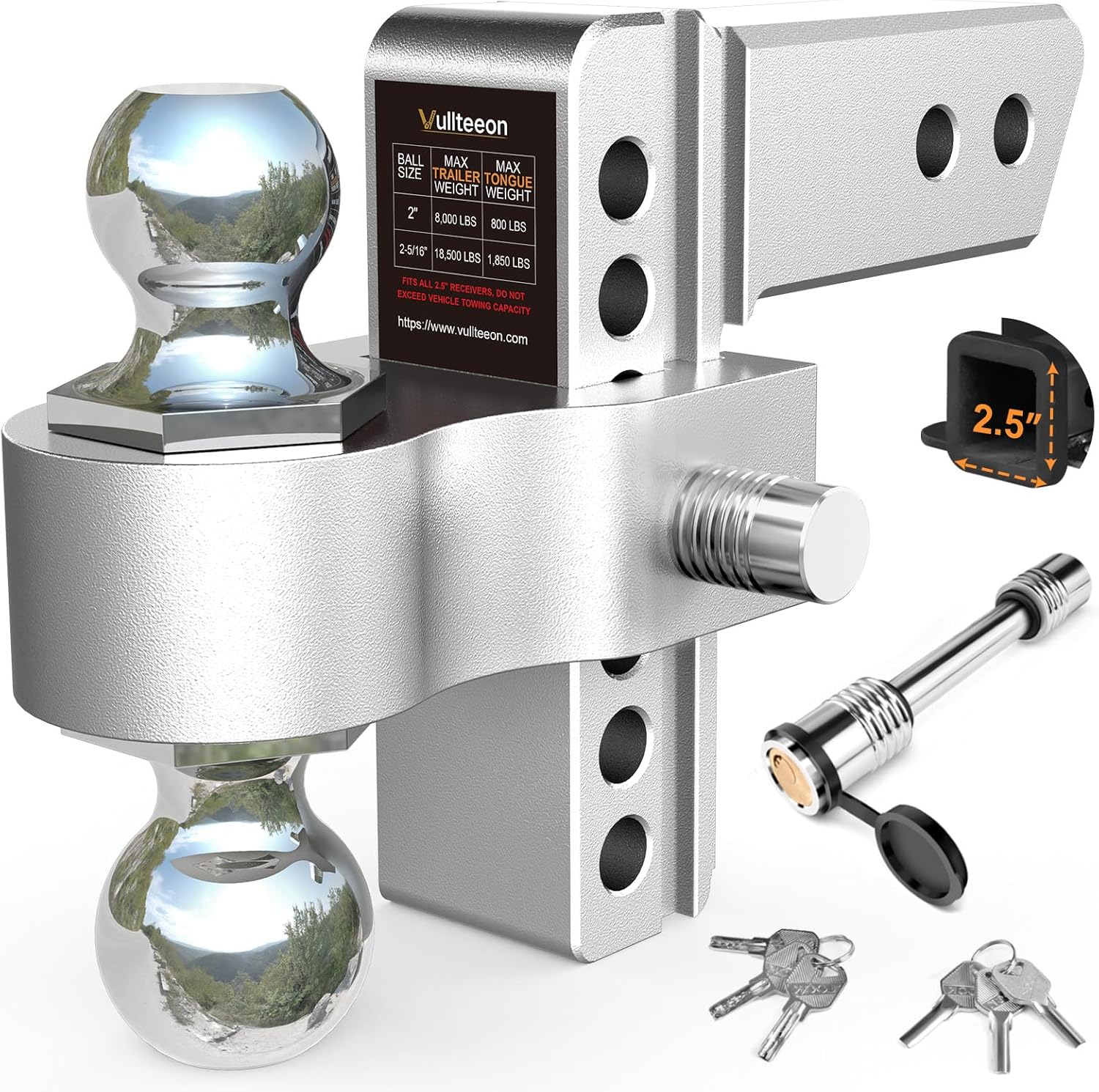 Drop Hitch 2.5 Inch Receiver 6 Inch Adjustable Trailer Hitch Ball Mount 18 500 LBS GTW (2" & 2-5/16") Chrome Plated Steel Balls Class 5 Aluminum Tow Hitches with 2 Anti-Theft Pins Locks