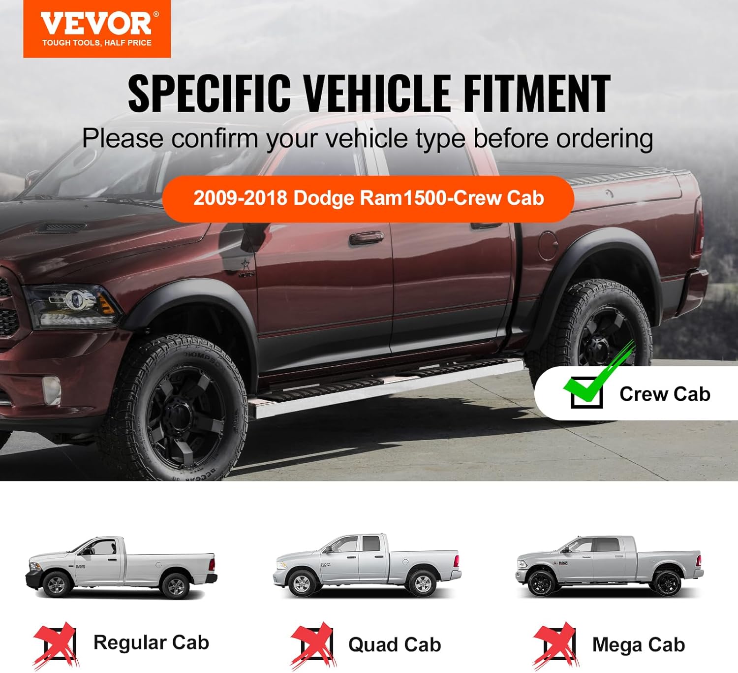 Running Boards 6" Step Bars Compatible with 2009-2018 Dodge Ram 1500/2010-2023 Ram 2500/3500 (Includes 2019-2023 Classic) Crew Cab 201 Stainless Steel Side Steps Nerf Bars 500LBS 2 PCS