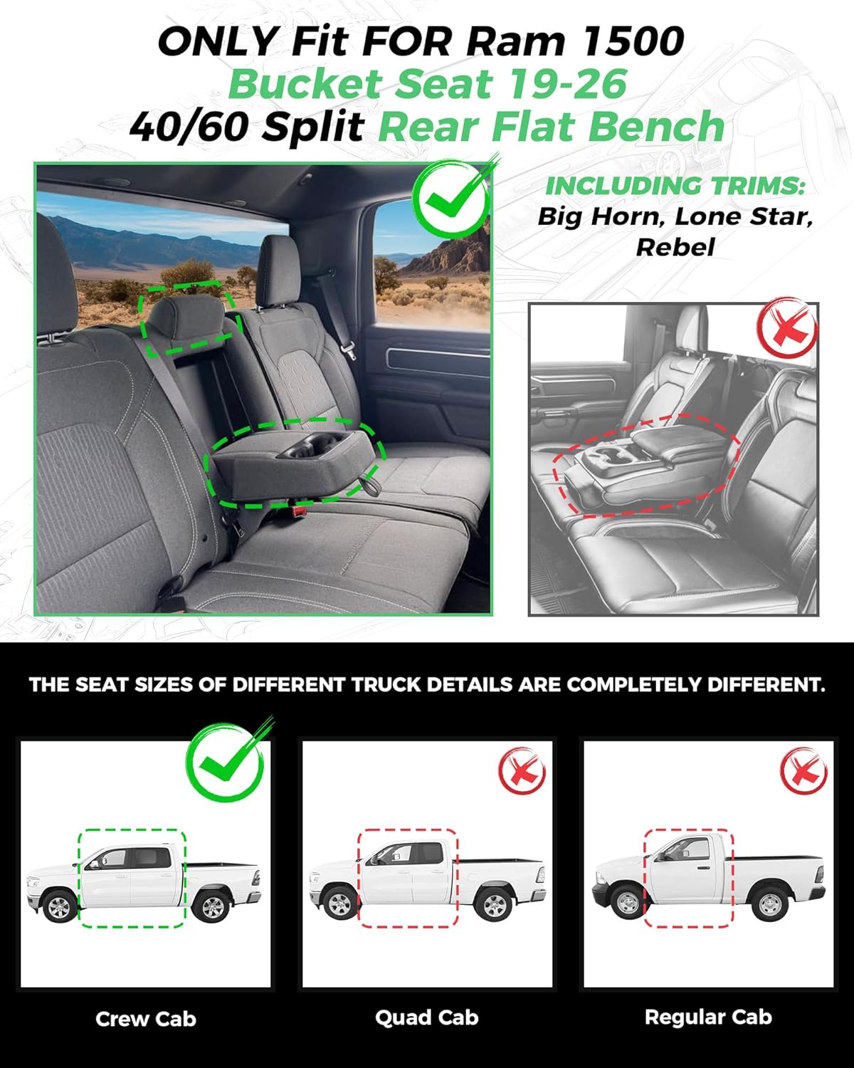 for Dodge Ram Leather Seat Covers 2019-2026 Crew Cab 1500 Big Horn Rebel Lone Star Custom Truck Seat Cover Full Set Pickup Protectors Accessories Black (40/60 Split Flat Bench)