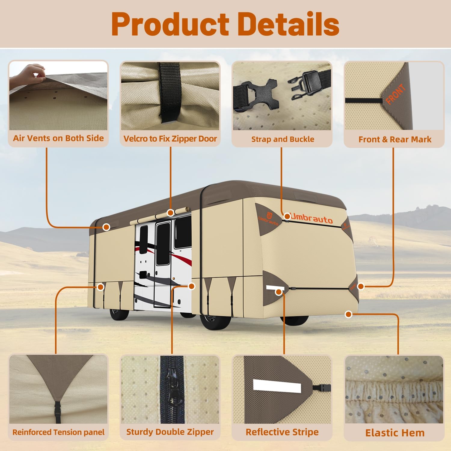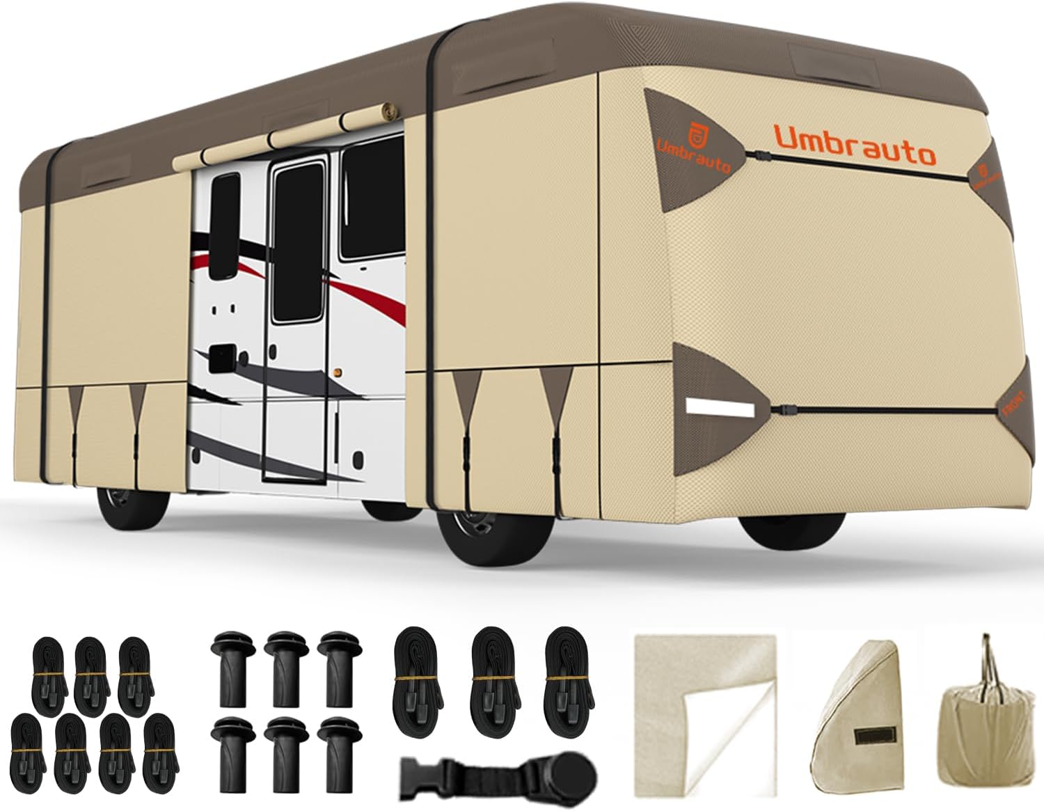 Class A RV Cover 34-38ft 7 Layer Top Heavy Duty Camper Cover Extra-Thick Waterproof Windproof Anti-UV Rip-Stop Class A Motorhome Cover with 2Pcs Extra Straps 6 Gutter Covers & 4 Tire Covers