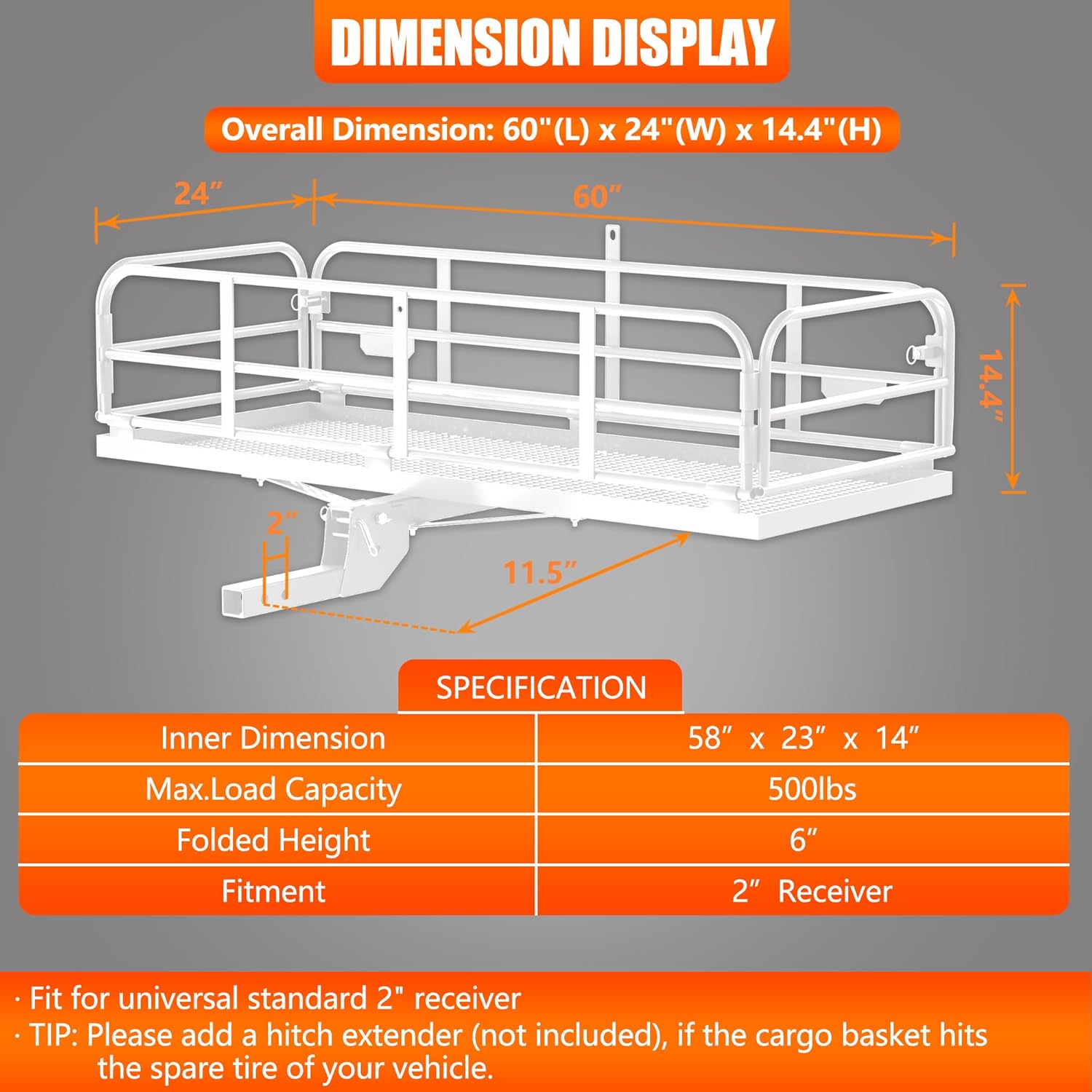 500 Lbs Heavy Duty Hitch Mount Cargo Carrier 60" x 24" x 14.4" Folding Cargo Rack Rear Luggage Basket Fits 2" Receiver for Car SUV Camping Traveling (White)