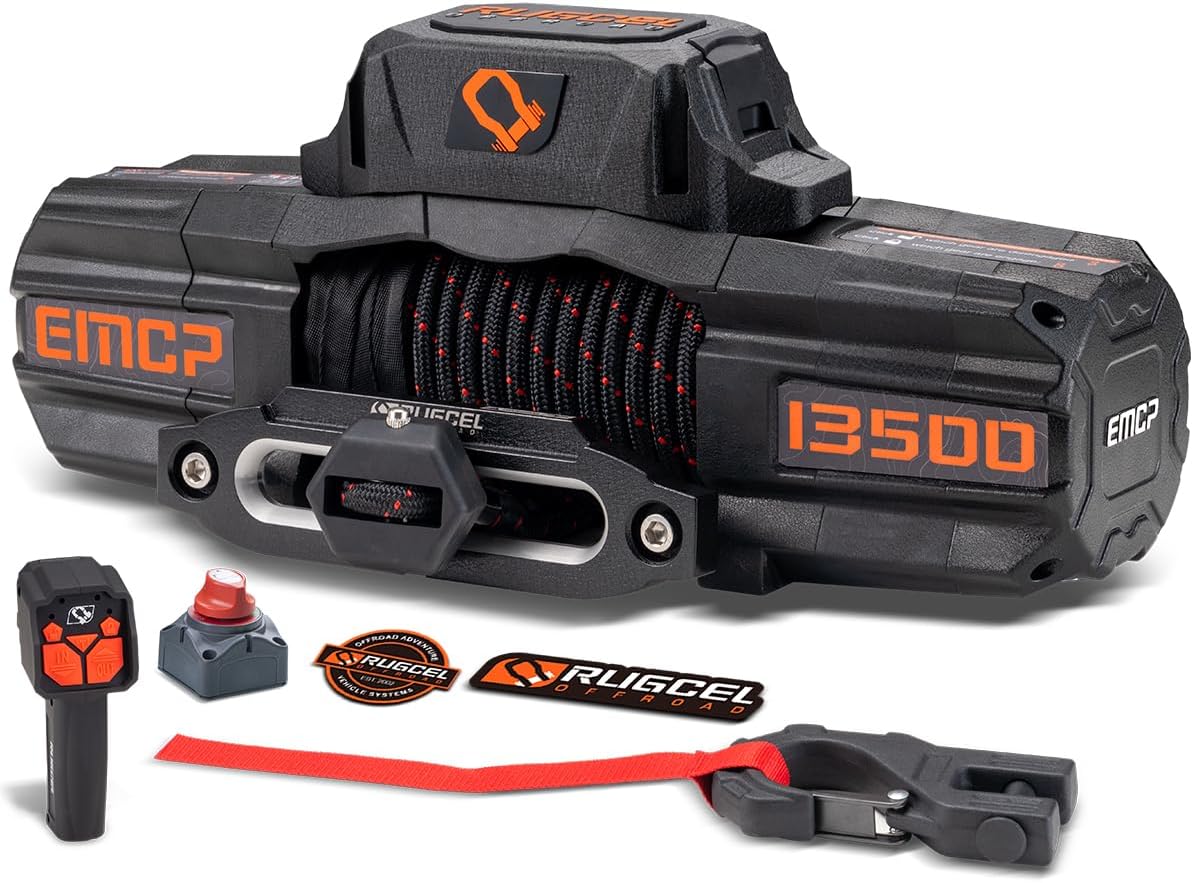 Winch-13500 lb. Load Capacity Electric Winch Kit 12V Synthetic Rope Waterproof IP67 Electric Winch with Hawse Fairlead with Wireless Handheld Remote and Corded Control Recovery
