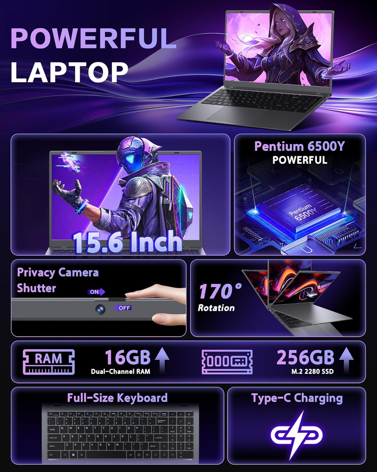 Laptop Computer 16GB RAM - Pentium 6500Y CPU (Beat N5095 Up to 3.4GHz) Laptops with 256GB SSD 15.6 inch FHD IPS Screen Type-C USB 3.2 HDMI Long Battery Life