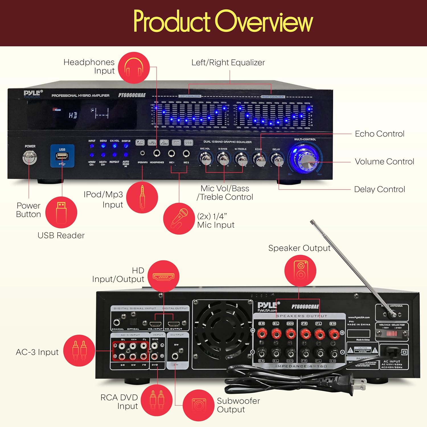 Bluetooth Hybrid Home Amplifier - 6-Channel 2000W Rack Mount Power Amplifier Receiver w/ Radio - Dual 10 Band EQ Karaoke Microphone x2 USB RCA COAX OPT DVD Inputs HiDef Input and Output