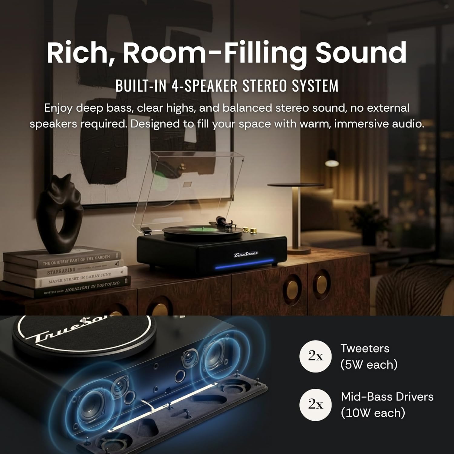 Hi-Fi Record Player with Speakers | Premium Vinyl Turntable with Bluetooth Capability | Built-in 4-Speaker Stereo System for Music Fans Black Veneer + Gold Trim