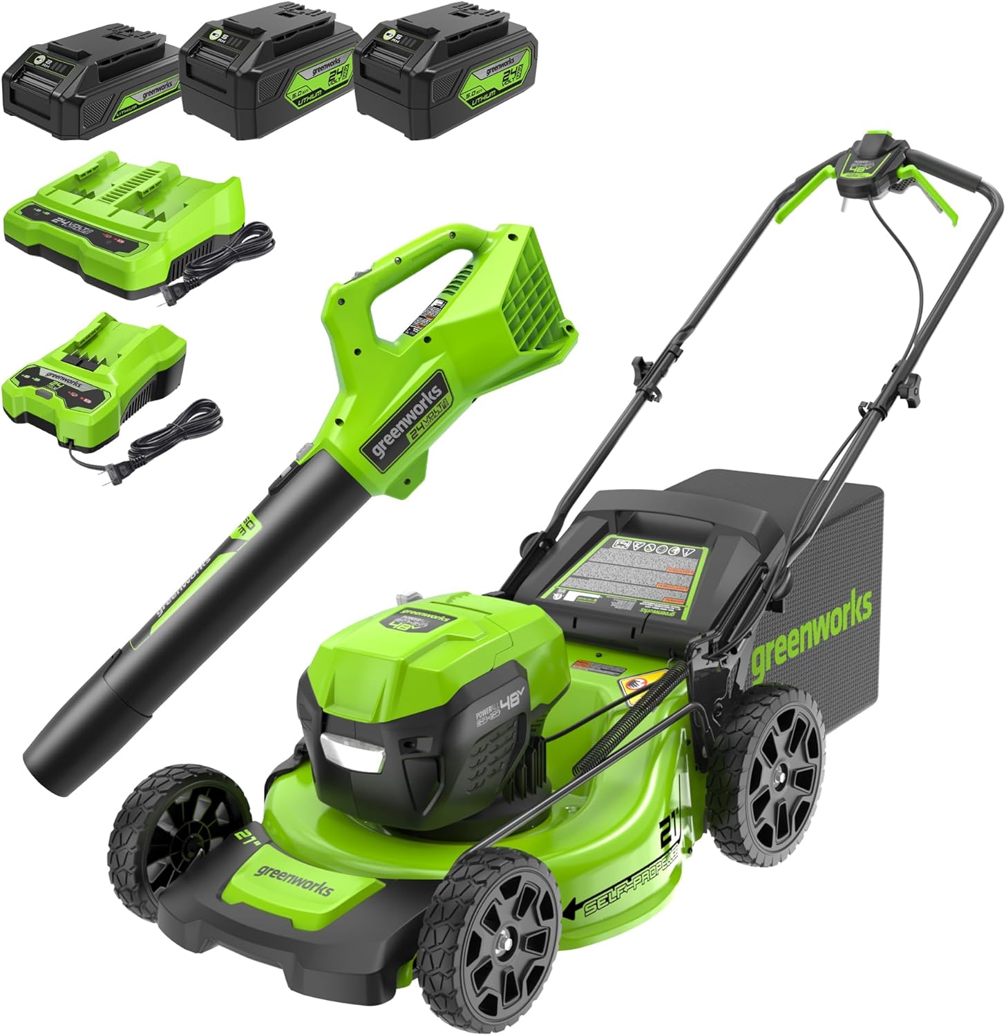 80V 21 Brushless (Self-Propelled) Cordless Electric Lawn Mower + (580 CFM) Axial Leaf Blower (75+ Compatible Tools) 4.0Ah Battery and 60 Minute Rapid Charger Green and Black