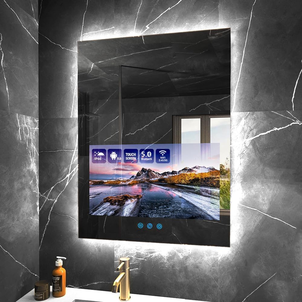Hkcvv 24x32 Inch Bathroom Vanity Mirror with 21.5" Touch Screen Smart System Side-Lit LEHkcvv Ambient Lighting IP66 Waterproof & Anti-Fog Streaming Apps Wi-Fi Bluetooth HHkcvvMI Wall Mounted (2025)