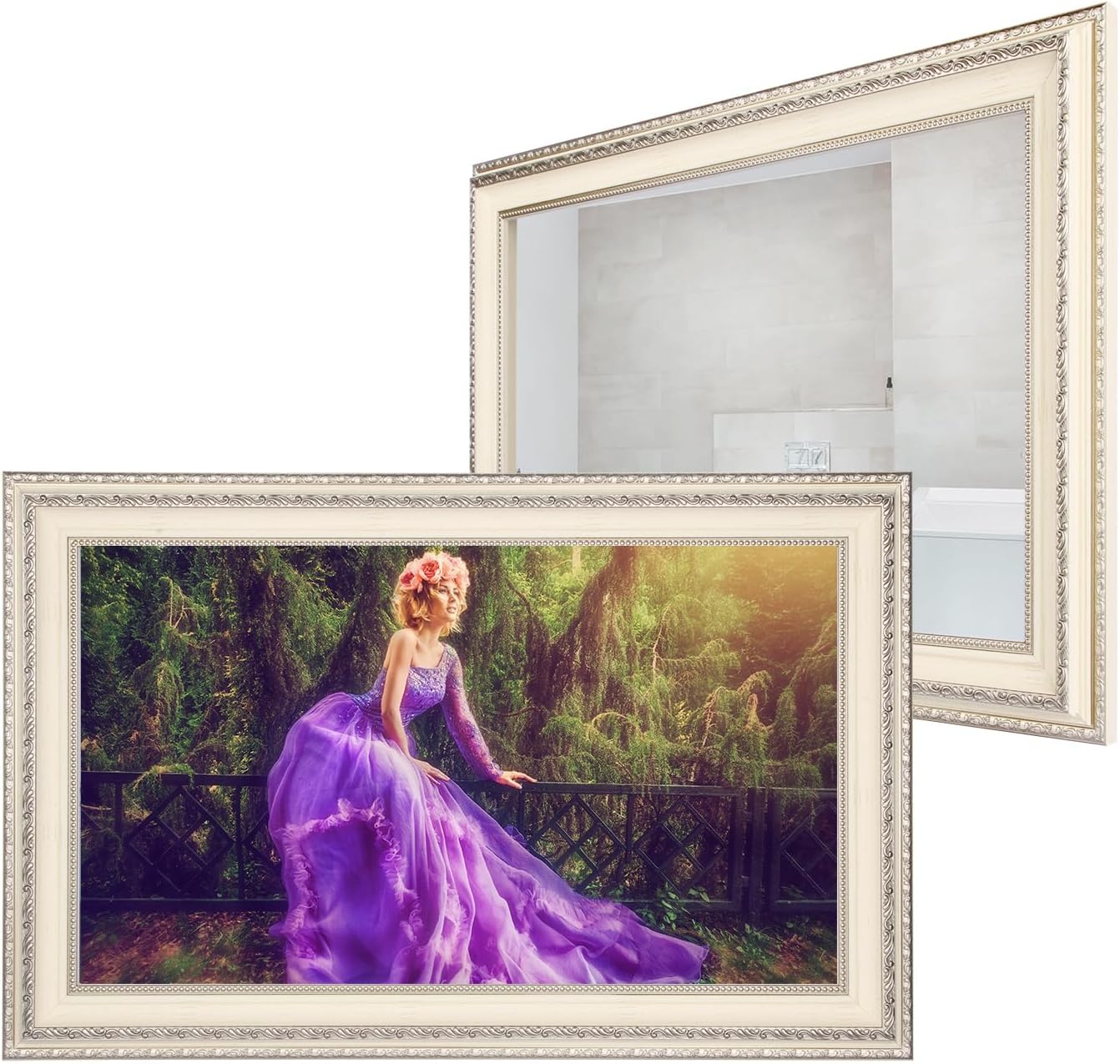 Hkcvv 27 inches Smart Mirror with Antique Ivory Color Frame TV Waterproof IP65 SPA Fireplace Wall Mount Hkcvvecoration Built-in Voice Control WiFi Bluetooth Entertainment Gallery Makeup Mirror