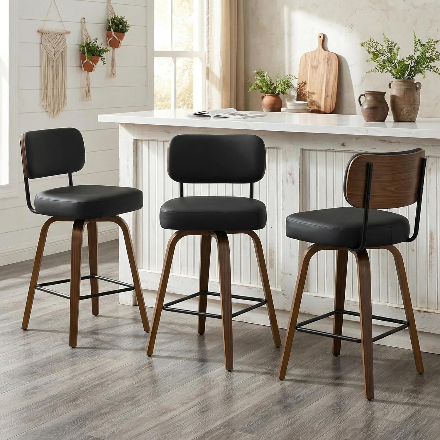 Swivel Bar Stools Set of 3, 26" Upholstered Counter Height Bar Stools with Back and Walnut Wood Legs, Faux Leather Barstools for Kitchen Counter, Black