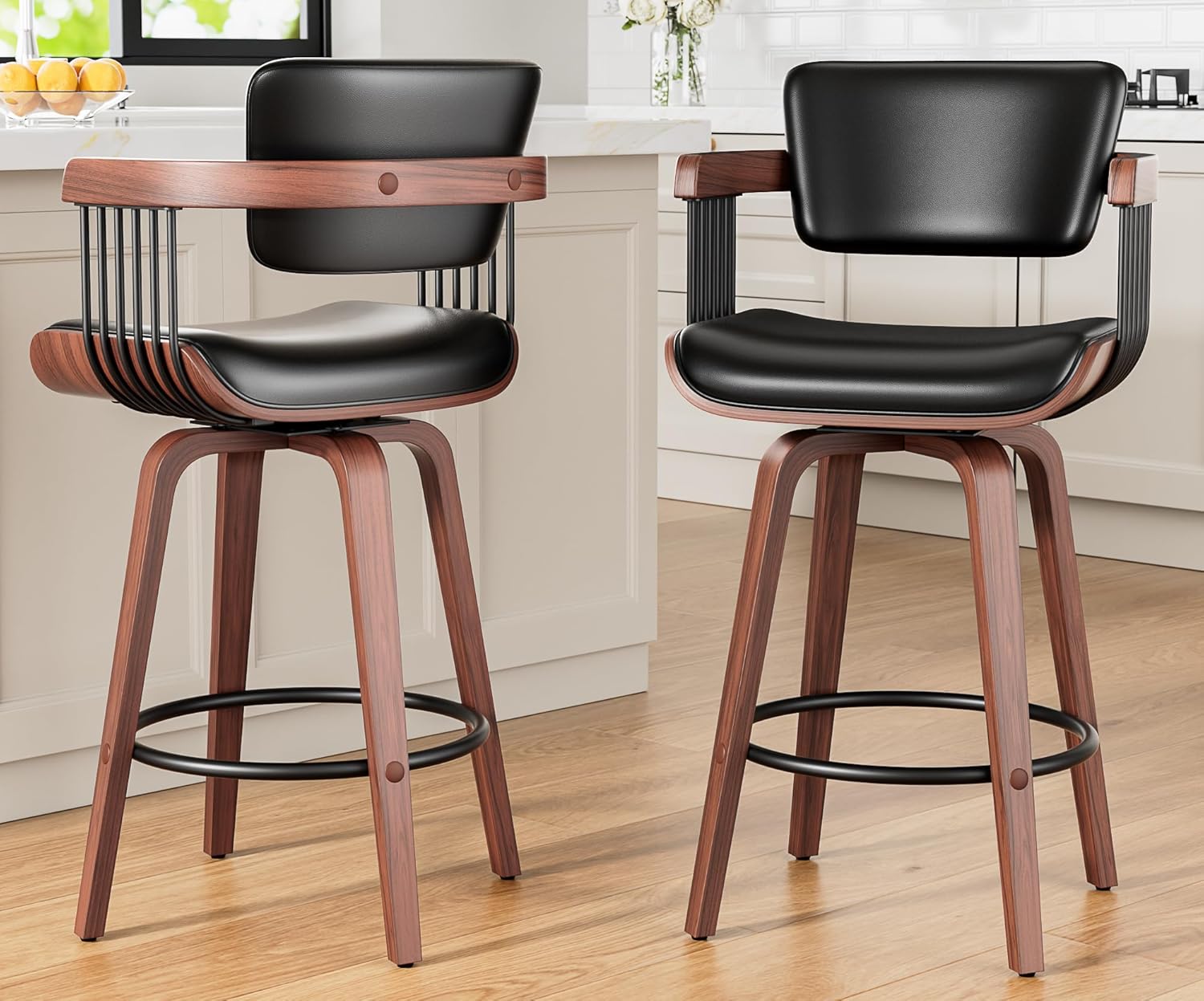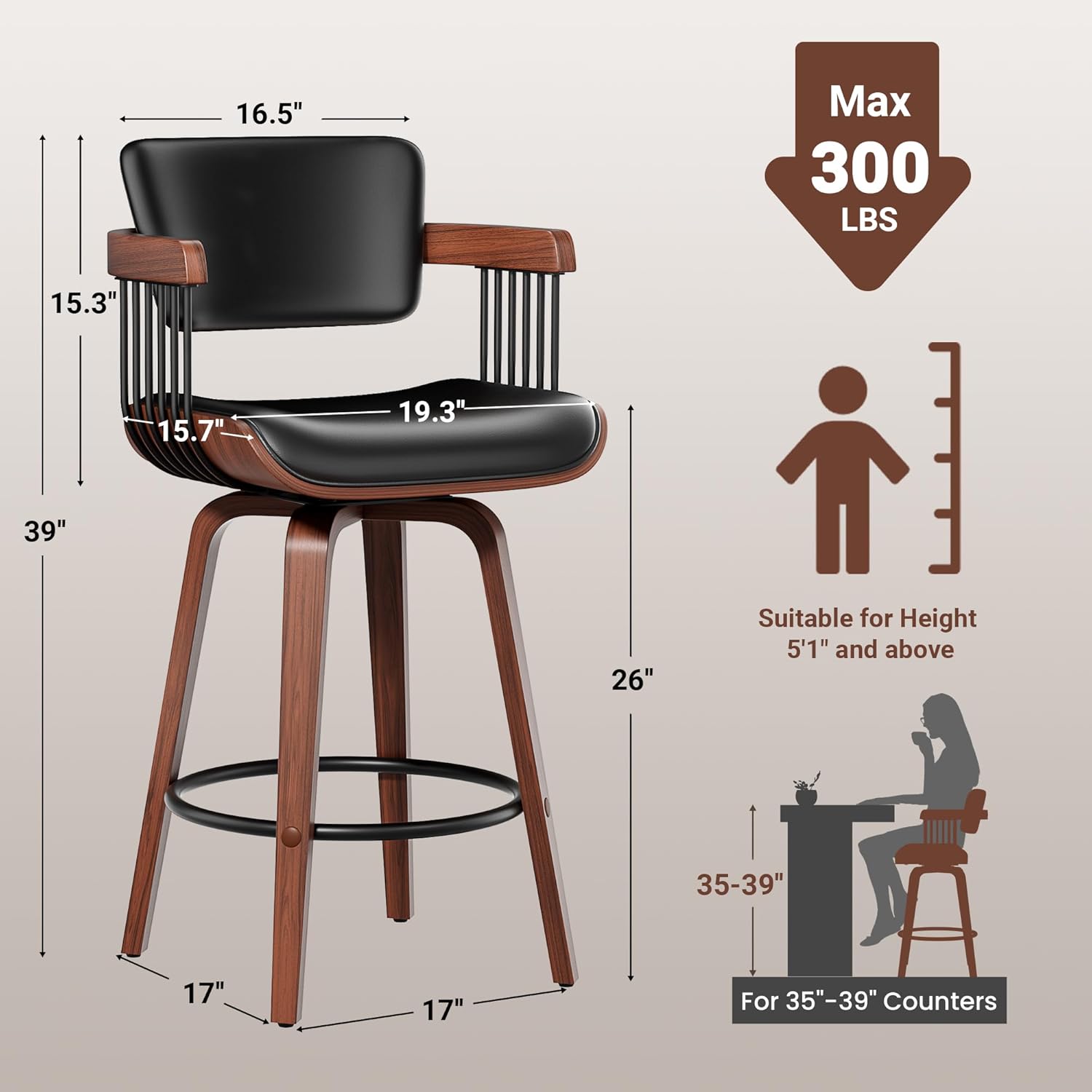Swivel Counter Height Bar Stools Set of 2, 26 Inch Mid Century Modern Bentwood Barstools with Padded Back and Wood Legs, PU Leather Kitchen Island Chairs with Arms, Black