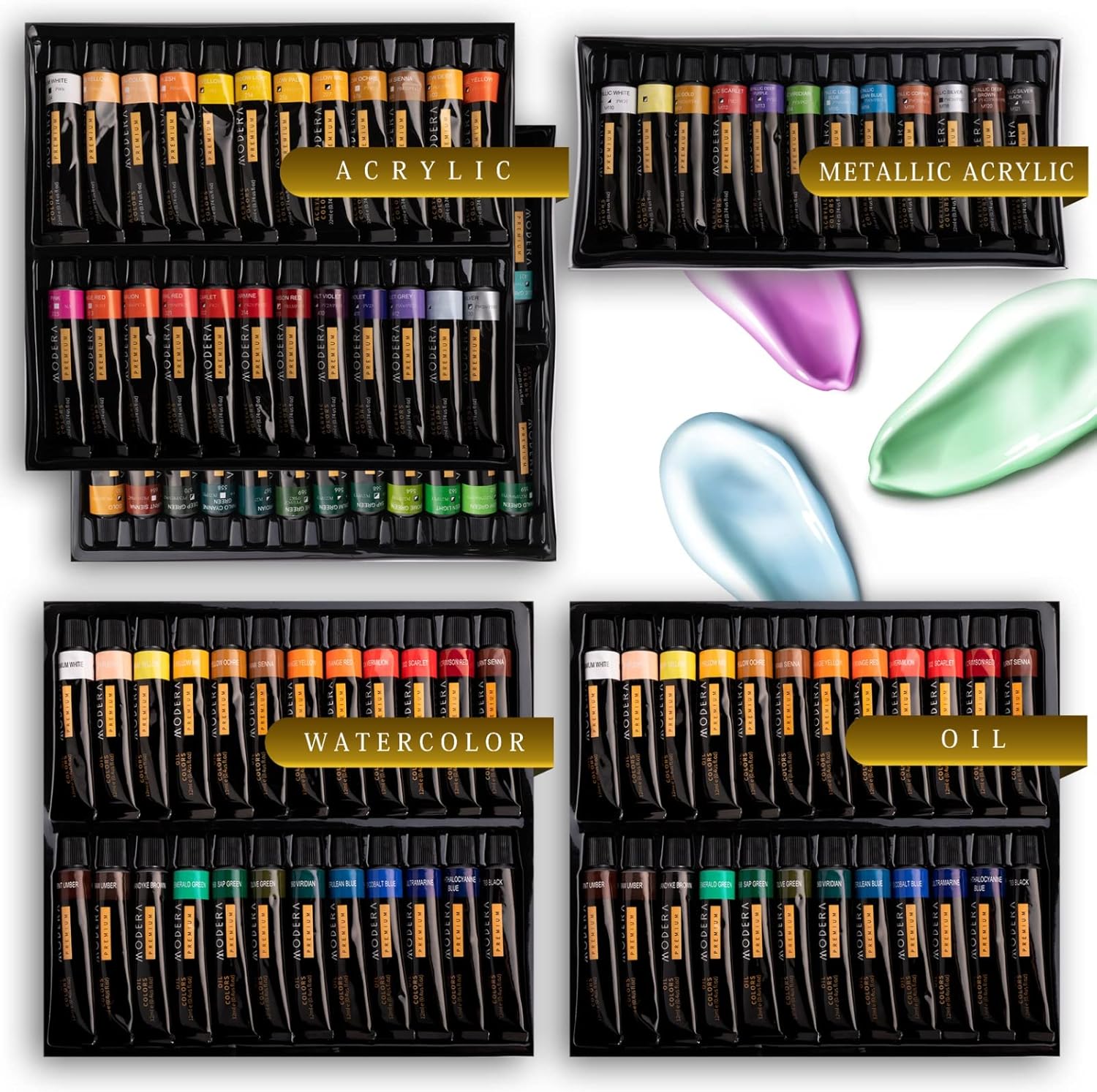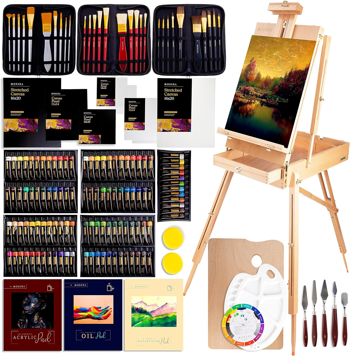 163-Piece French Easel Painting Set | All-in-One Deluxe Artist Starter Kit w/Wooden Field & Studio Sketch Box Easel for Adult 100+ Professional Paints Stretched & Panel Canvases Brushes Palettes