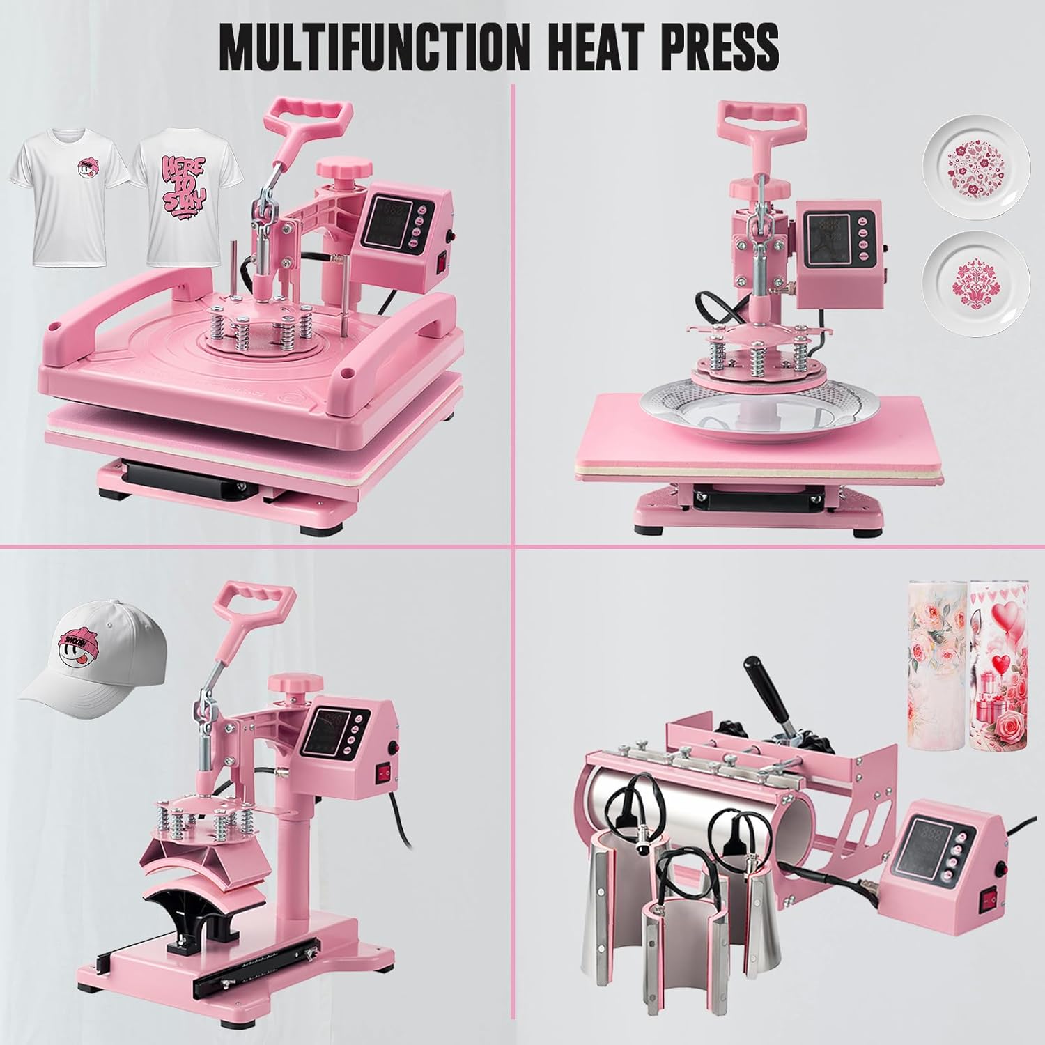 8 in 1 Heat Press Machine 15x15 Inch Heat Press Machine for T Shirts Hat Cap Mug Plate 360 Swing Away Sublimation Heat Press Heat Transfer Machine W/ 30OZ Tumbler Press Pink